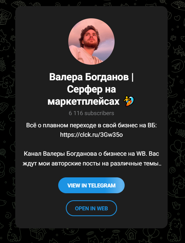 Для продвижения своих услуг Валера выстроил целую сеть информационных каналов. Главная площадка — это телеграм-канал под названием "Валера Богданов | Серфер на маркетплейсах" ( t me/wbogdanoff ). На бумаге (вернее, на экране смартфона) все выглядит неплохо: около 6,2 тысяч подписчиков, регулярные публикации . Автор делится фишками продвижения товаров, рассуждает о плюсах работы с минимальными вложениями и регулярно записывает видео-"кружочки" о своей деятельности.