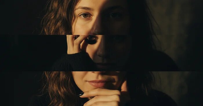 Это для тех, кто хочет чего-то необычного. Три горизонтальных фрагмента - глаза, рука у лица, губы - собранные в один вертикальный коллаж. Выглядит как постер к фильму.