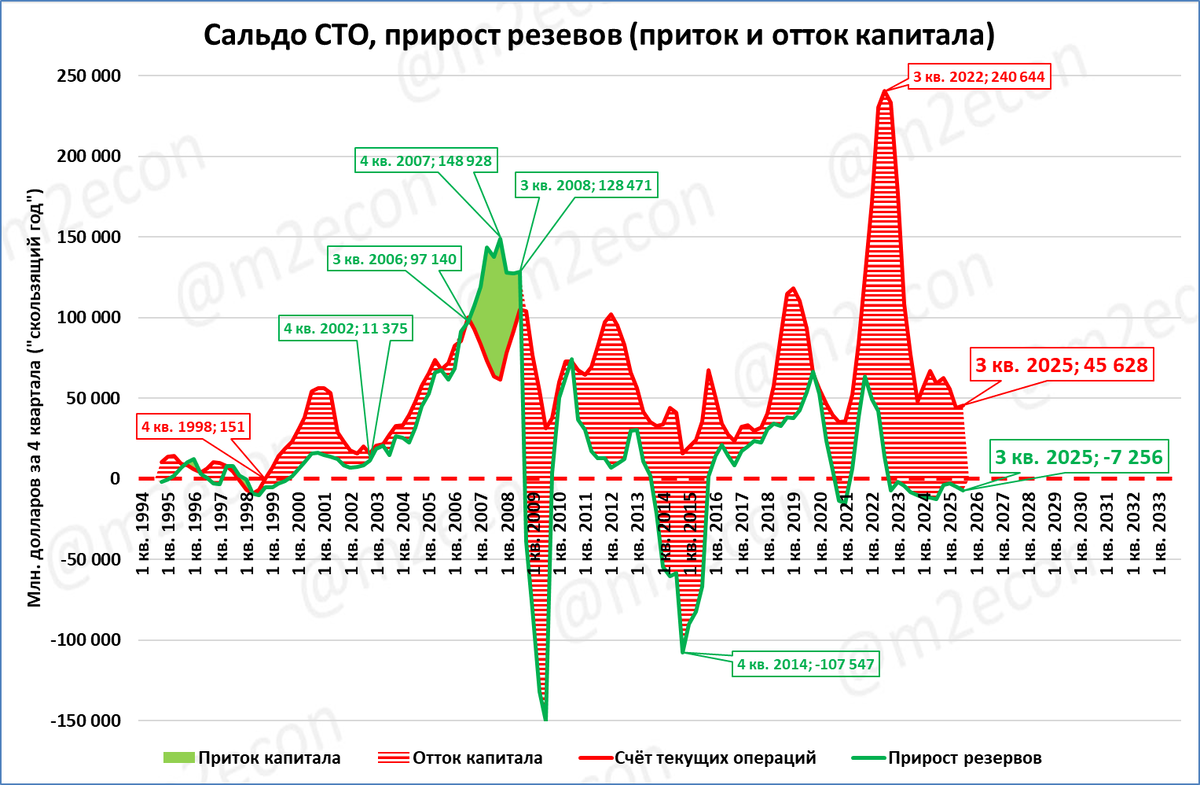 Отток-приток капитала -- это не про "институты и условия для бизнеса". Это про то, действует ЦБ или бездействует. Иногда само понятие "приток-отток" капитала люди понимают с трудом или понимают неправильно. Попробуем разобраться в очень простой форме, как говорится -- "на пальцах". Для этого нам будет достаточно одного графика. На нём нанесены всего две линии. Красной линией показан счёт текущих операций. Грубо -- это то, что страна заработала в ходе внешней торговли товарами и услугами (сальдо). Зелёной линией показан прирост золотовалютных резервов. В обоих случаях приведены данные за "скользящий год" -- за последние 4 квартала. Если страна заработала "на внешнем рынке" 50 млрд. долларов, а золотовалютные резервы пополнились на меньшую сумму (см. 1 кв. 2001 года), то разница превращается в отток капитала. На графике отток заштрихован красным цветом. Но ЦБ может не только "проворонить" полученные внешнеторговые доходы. Он может сделать ещё хуже: провести валютные интервенции. Т