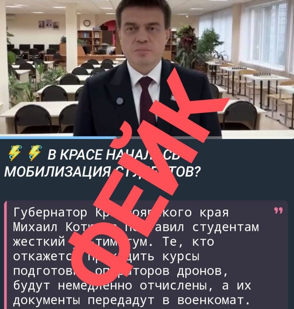 Власти Красноярского края опровергли информацию о якобы проводимой в регионе мобилизации студентов. «По интернет-пабликам в Красноярском крае распространяется ложная информация о якобы проводимой мобилизации студентов. Всегда проверяйте информацию и читайте официальные источники», — говорится в комментарии в телеграме правительства региона. В сообщении, скрин которого приложен к посту, говорится о том, что губернатор Михаил Котюков якобы «поставил студентам жёсткий ультиматум» о необходимости пройти курсы операторов дронов, в противном случае — отчисление. Подписаться| Прислать новость| Помочь бустами