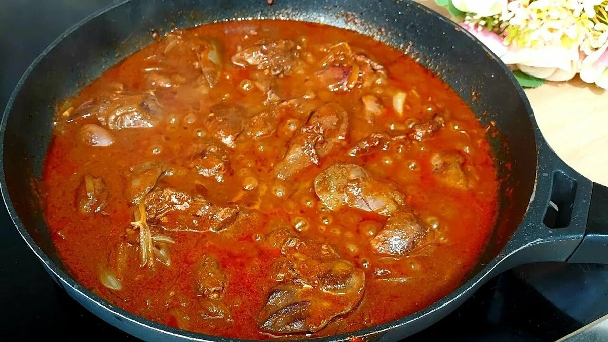 Печенку вымыть, нарезать ломтиками, обвалять в муке. лук разрезать. В глубокой сковороде разогреть растительное масло и обжарить печенку с обеих сторон. Добавить лук и через несколько минут растертый с солью чеснок и томатную пасту. Все вместе обжарить в течение нескольких минут, заправить приправой, которую вы любите, мне нравится овощная. Подавать с белым хлебом или рисом. Ингредиенты: 400 гр. печенки, 3 ст. ложки растительного масла, 2 большие луковицы, 4 дольки чеснока, соль, приправы, 2 ст. ложки томатной пасты