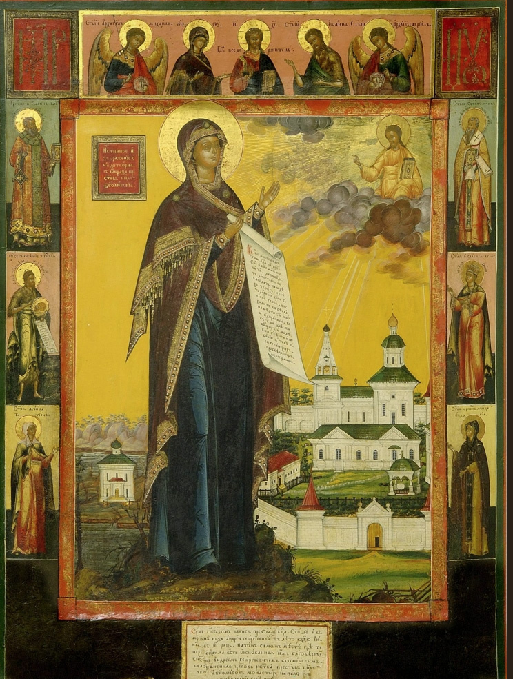 Богоматерь Боголюбская- икона список с древнего чудотворного образа. Богоматерь изображена перед монастырем, нарисованным с детальной точностью – редкость для палехской иконописи. Верхнее поле иконы занимает Деисус. Слева и справа от нее святые: преподобный Иоанн патриарх Царьграда, Иоанн Предтеча с Усекновенной главой, святая мученица Татьяна. Справа сверху вниз: священномученик Тимофей епископ прусский, святая великомученица Ирина, святая преподобномученица Евдокия.