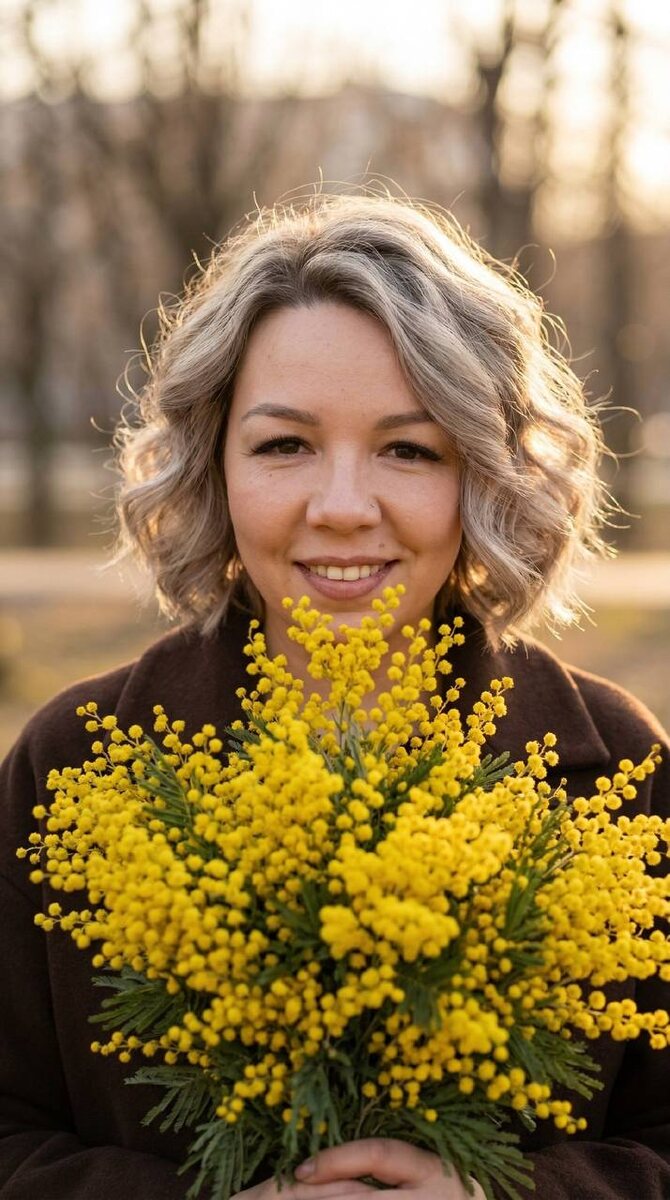 👇🏻 🌟Переходим на удобный сервис для генерации: Ссылка 👉 Syntx Ai Ссылка 👉 Veo3 📌ИНСТРУКЦИЯ ПО ИСПОЛЬЗОВАНИЮ В ЗАКРЕПЛЕННЫХ СООБЩЕНИЯХ ◾️ПРОМТ : Не меняй черты лица.. Фотореалистичный outdoor portrait, золотой час ранней весны, тёплый контровой солнечный свет, мягкое свечение по волосам. Волосы у девушки цветом как на фото, короткие, но густые, с очень объемными волнами.Она в тёмном пальто шоколадного оттенка. Она держит огромный пышный букет жёлтой мимозы на переднем плане, букет занимает 70% кадра и частично закрывает нижнюю часть лица, видны глаза и улыбка; поза 3/4, плечи слегка развернуты, голова повернута к камере, выражение тёплое, лёгкая улыбка. Фон: размытая улица/парк, голые ветки деревьев, мягкое кремовое боке, без деталей и людей. Композиция вертикальная 2:3, средний крупный план, фокус на глазах и фактуре мимозы, фон сильно размыт. Цветокоррекция тёплая, медово-золотая, лёгкое зерно, натуральная кожа без пластика. Камера: 85mm, f/1.8–2.2, ISO 200, 1/800. Фот