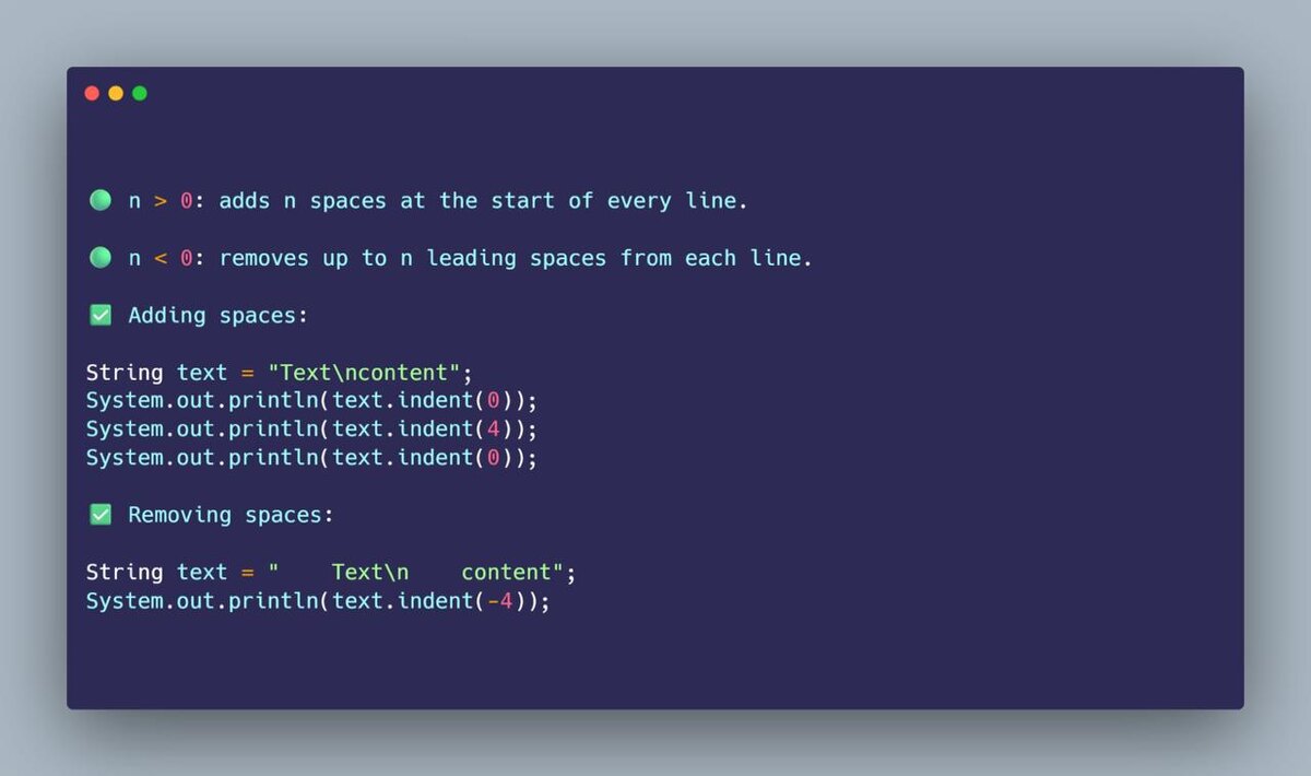 💡 Совет по Java: Начиная с Java 12 можно использовать String.indent(n) для форматирования многострочных строк с отступами
