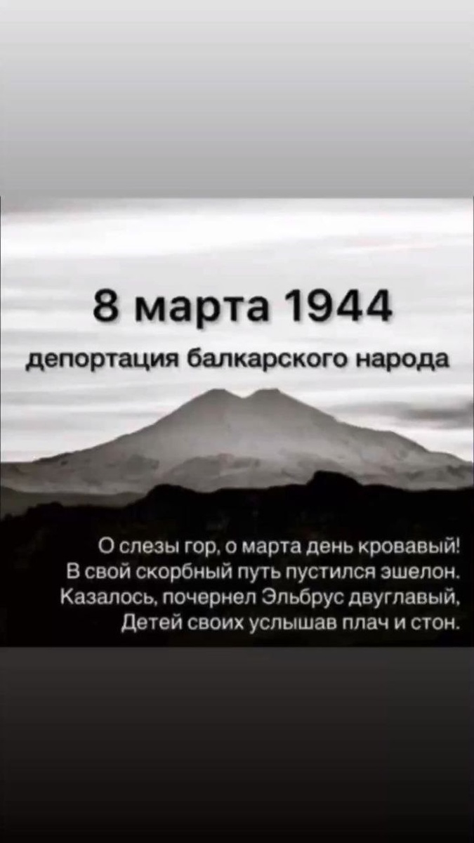 *** Восьмое марта, где ты, праздник чудный, Когда приносят женщинам цветы? Балкарские селения безлюдны... О, что страшнее этой пустоты! Пришел не праздник – день пришел бессонный. Балкарским детям не забыть вовек Холодные и смрадные вагоны И мартовский – в слезах кровавых – снег. Кайсын Кулиев 8 марта 1944 года — день, который навсегда остался в памяти балкарского народа как одна из самых трагических страниц истории. В этот день началось принудительное выселение балкарцев в Среднюю Азию. Долгие 13 лет изгнания показали невероятную стойкость балкарского народа, который сумел сохранить культуру, язык, традиции, а главное - любовь к Отчизне и веру, что вернется к земле отцов. Пусть память о тех событиях станет для нас примером силы духа и взаимопомощи. Текст Союза писателей КБР.
