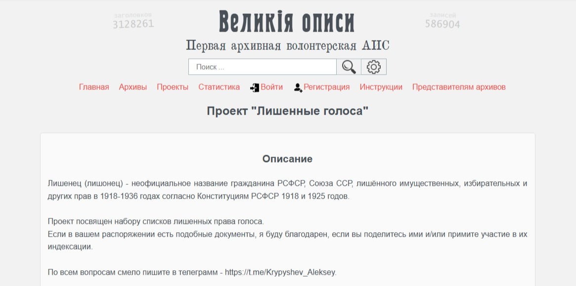 ! Лишенные голоса 541 житель Рославля и 271 житель Слуцка (Павловска) и Детского села (Пушкина) стали первыми в новом проекте Великих Описей "Лишенные голоса" Списки доступны по ссылкам: Рославль ➡️https://inv.velikie.org/doc/did1147/ Слуцк и Детское село ➡️https://inv.velikie.org/doc/did1148/ Оригинальные документы рославльцев размещены в этом канале ТУТ За вторых огромное спасибо ❤️Марии Максутовой, оригинальный список ТУТ Лишенец (лишонец) - неофициальное название гражданина РСФСР, Союза ССР, лишённого имущественных, избирательных и других прав в 1918-1936 годах согласно Конституциям РСФСР 1918 и 1925 годов. Проект посвящен набору списков лишенных права голоса. Если в вашем распоряжении есть подобные документы, можете поделиться ими и/или принять участие в их индексации. По всем вопросам смело пишите в телеграмм руководителю проекта Алексею Крупышеву - https://t.me/Krypyshev_Aleksey Спасибо огромное Алексею и Дине Крупышевым за реализацию этого проекта ❤️ 🔠🔠©️ https://dzen