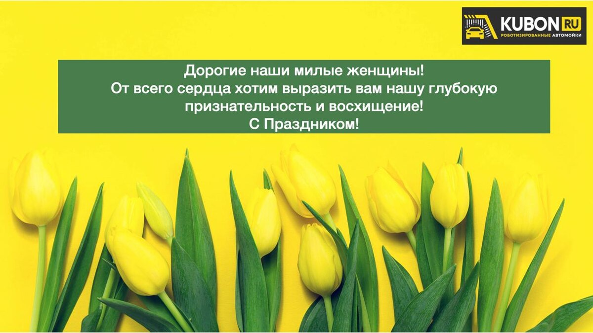 ! От всего сердца хотим выразить вам нашу глубокую признательность и восхищение! Мы очень ценим и любим вас! Вы вдохновляете нас на новые свершения и делаете наш каждый день ярче и продуктивнее! В этот прекрасный весенний день мы желаем вам безграничного счастья, искренней радости, всепоглощающей любви, мира в душе и вокруг, крепкого здоровья и всего самого благого, что только может быть на нашей Земле! Пусть каждый ваш день будет наполнен улыбками, теплом и приятными сюрпризами. С праздником 8 Марта! С уважением и любовью, мужчины компании КУБОН
