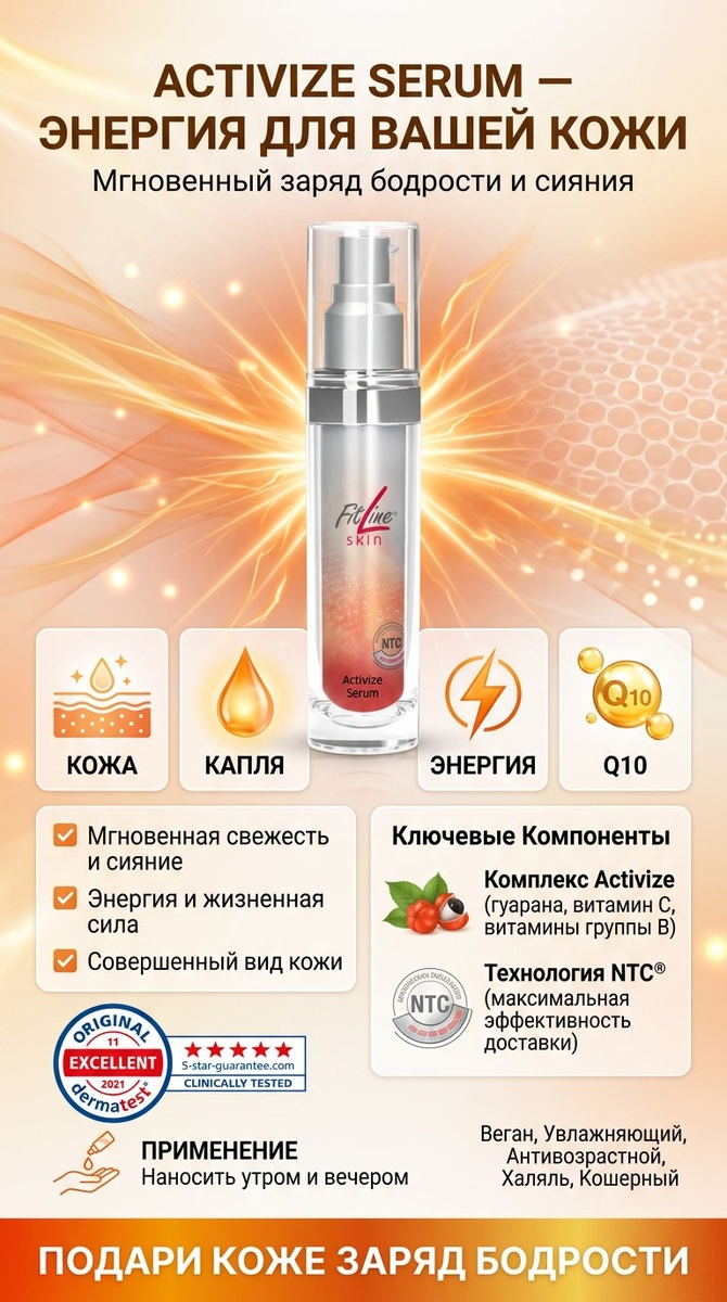 Испытайте чистую энергию, силу и свежесть — мгновенно! Activize Serum — это инновационная формула, которая сочетает эксклюзивную концепцию транспортировки питательных веществ (NTC®) с уникальным комплексом активных ингредиентов Activize, состоящим из гуараны, витамина С и комплекса витаминов группы В. Ключ к мгновенным результатам и совершенному виду кожи! Нанесите небольшое количество сыворотки на очищенную кожу лица и шеи утром и/или вечером. Дайте впитаться, затем нанесите крем 4ever. Сертифици 📖 Читать статью 🛒 Смотреть продукт