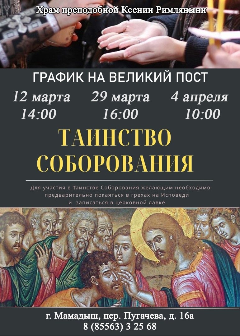 ⬛⬛⬛ ⬛ ПОНЕДЕЛЬНИК 9 марта - Первое и второе обретение главы Иоанна Предтечи Литургия Преждеосвященных Даров: 8.00 ⬛ СРЕДА 11 марта Литургия Преждеосвященных Даров: 8.00 По окончании заупокойная лития ⬛ ЧЕТВЕРГ 12 марта 14.00 Таинство соборования ⬛ ПЯТНИЦА 13 марта Литургия Преждеосвященных Даров: 8.00 По окончании заупокойная лития Вечернее богослужение: 16.00 ⬛ СУББОТА 14 марта - Поминовение усопших Литургия: 8.00 по окончании панихида Вечернее богослужение: 16.00 Изнесение Креста ⬛ ВОСКРЕСЕНИЕ 15 марта Молебен: 7.30 Литургия: 8.00 ПАССИЯ: 16.00 Источник: https://vk.ru/wall-175166924_4717 ✅ Подписаться l Мы в Max