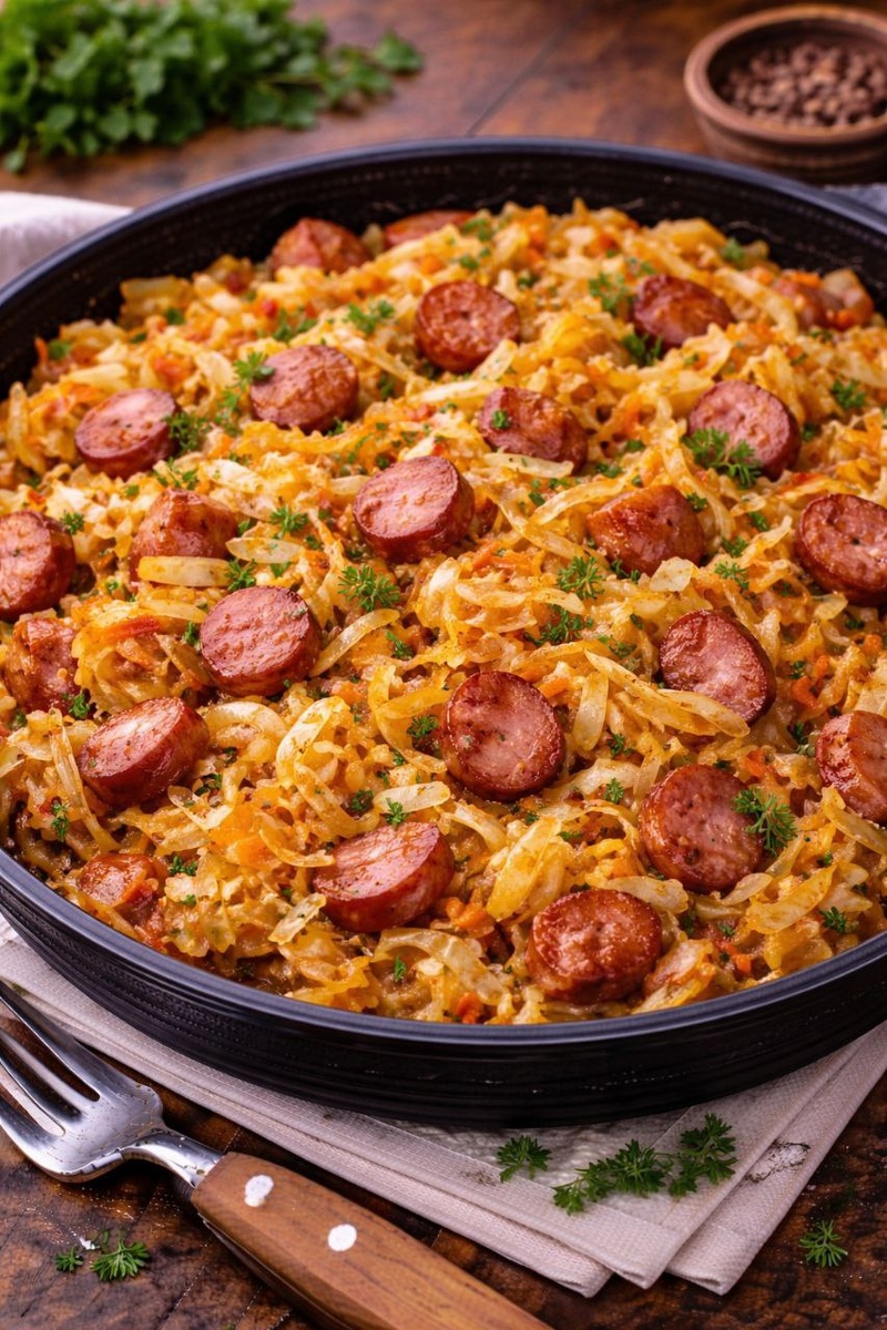 Иногда открываешь холодильник и понимаешь: ничего особенного нет. Полкочана капусты, кусок колбасы, лук. Но именно из таких простых продуктов часто получаются самые уютные блюда. Я люблю такие рецепты — когда не нужно идти в магазин за редкими ингредиентами. Всё максимально просто, быстро и по-домашнему.