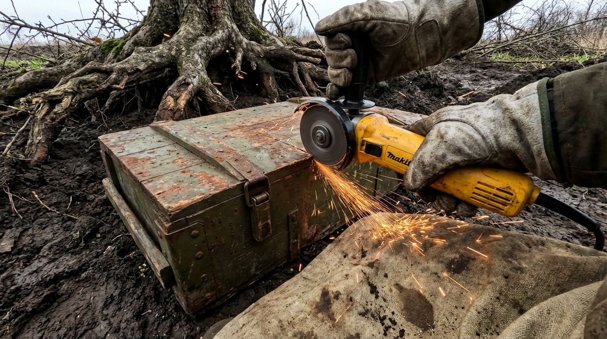 Крышка оказалась не просто закрыта, а герметично запаяна толстым швом по всему периметру. Я достал из багажника свою верную углошлифовальную машину Makita, аккуратно установил новый тонкий отрезной диск по металлу Луга 125х1.0 и плотно надвинул защитные пластиковые очки. Металл отчаянно визжал под абразивом, снопы ярких искр слепили глаза, а запах горелого озона щекотал ноздри. Когда последний сантиметр шва лопнул, внутри раздался тихий, свистящий хлопок — резко выровнялось атмосферное давление. Этот идеальный тайник явно не видел дневного света почти целое столетие.