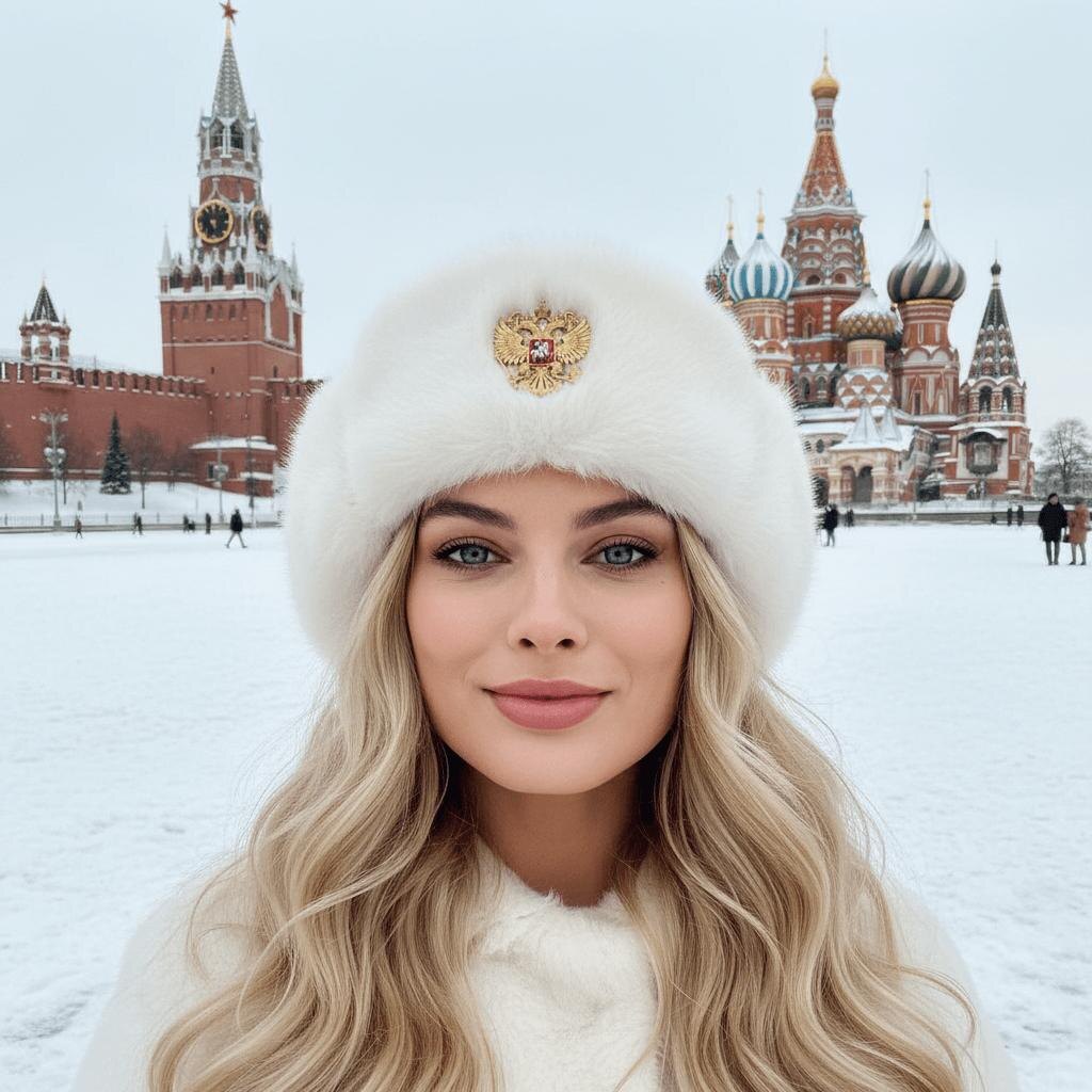 Сгенерировать фото⚡️ Используй лицо женщины с загруженного фото. Создай портрет, не меняя черты лица. Реалистичное селфи красивой молодой женщины на Красной площади в Москве зимой. На ней белая меховая шапка-ушанка с золотым гербом России по центру. У девушки выразительные глаза, длинные волнистые волосы и безупречный макияж, кожа слегка загорелая. На заднем плане заснеженная площадь, Спасская башня Кремля и собор Василия Блаженного. Атмосфера зимнего дня, мягкое естественное освещение, высокое разрешение, качество мобильной фотографии для соцсетей. Эстетика современной Москвы, зимний городской стиль, живые эмоции, эффект широкоугольной линзы смартфона. Профессиональное освещение, 8К. 9:16