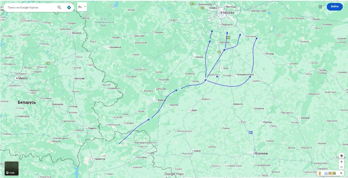 - прорываются по границе Калужской и Тульской и потом рассыпаются широким фронтом от Обнинска до Егорьевска. Приблизительно набросал схему схемы и карты
