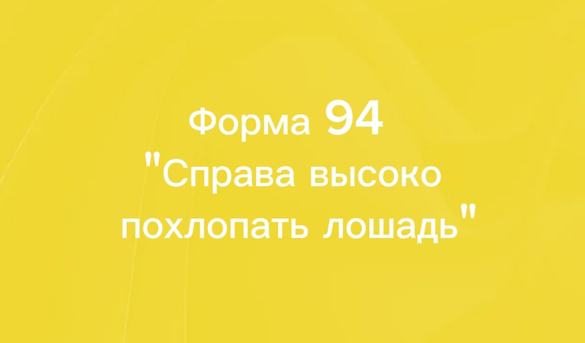 Конечное положение формы 94. Вы удерживаете вес на согнутой правой ноге лицом на запад. Левая нога расслаблена, левая ступня с расслабленной лодыжкой рядом с правой ступней. Правая рука согнута в локте под прямым углом, правая кисть на уровне лица раскрыта ладонью на юг пальцами на запад по диагонали вверх. Левая рука согнута под прямым углом, локоть рядом с талией, левая ладонь направлена вверх пальцами на запад. Это Исходное положение формы 95.