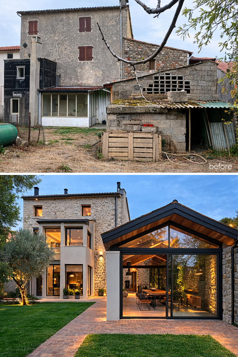 На верхнем фото — старый сельский дом на юге Франции, в регионе Лангедок. Здание построено из местного известнякового камня и десятилетиями обрастало случайными пристройками: бетонным сараем, низкими навесами из шифера и хозяйственными блоками. Двор был захламлён, фасад потемнел, окна были маленькими и закрыты ставнями. Дом выглядел скорее как хозяйственная постройка фермы, чем как жилое пространство.