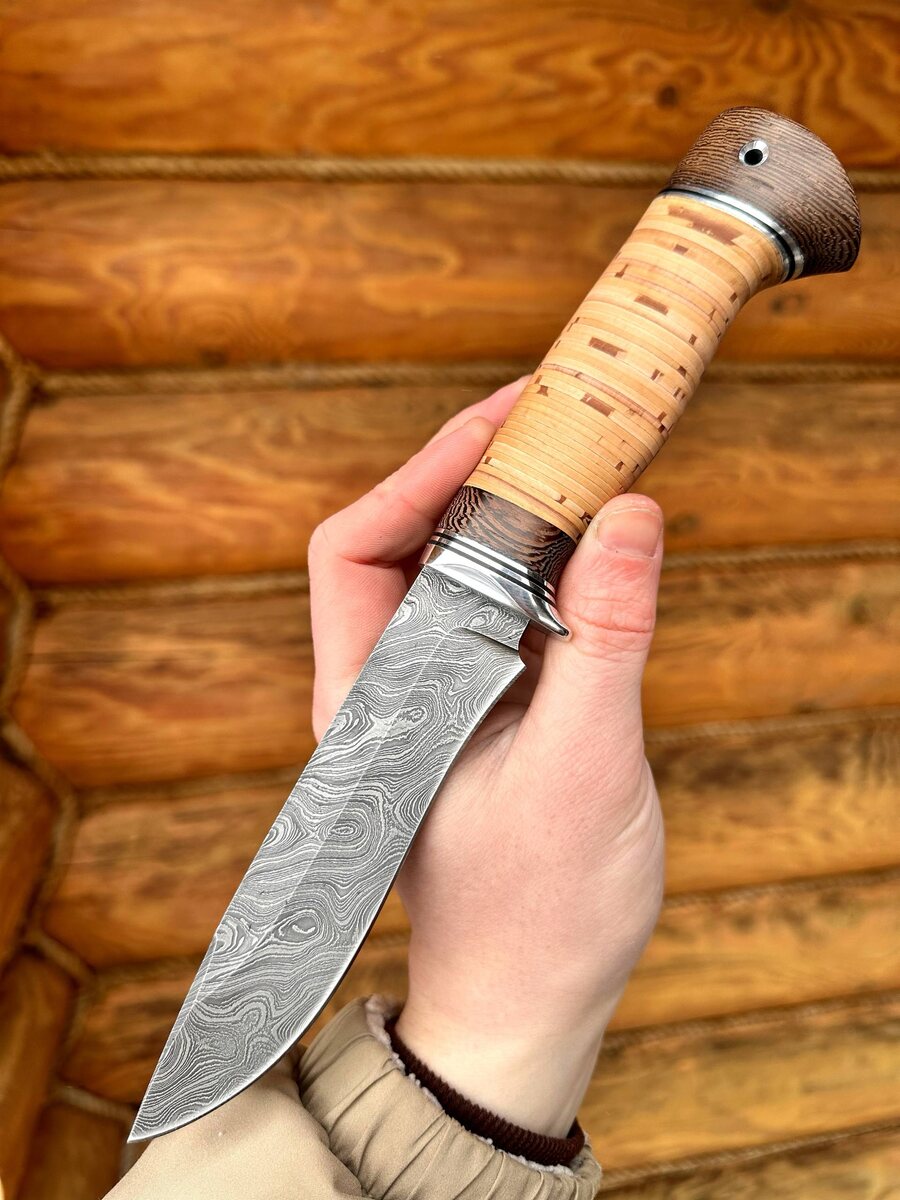 Спуски идут от середины клинка, что делает нож более прочным при боковых нагрузках. Рукоять теплая из бересты, не скользит в руке и не боится воды. Нож заточен в бритву. Твердость клинка (HRC): 62 Цена за нож: 10.040 рублей, со скидкой: 8.740 рублей. В комплекте идут ножны из натуральной кожи. Можем сделать формованные ножны +8000 рублей. Для заказа писать на @Nazarklinokbot или по тел +79101343831 WhatsApp/Viber