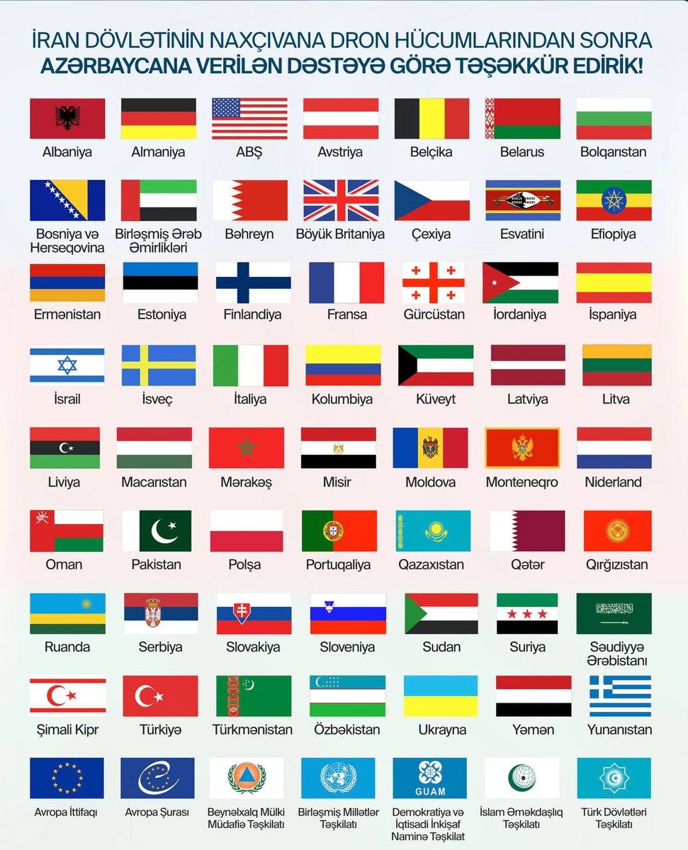 Азербайджан поблагодарил дружественные страны за поддержку после атаки иранских дронов на Нахчыван.