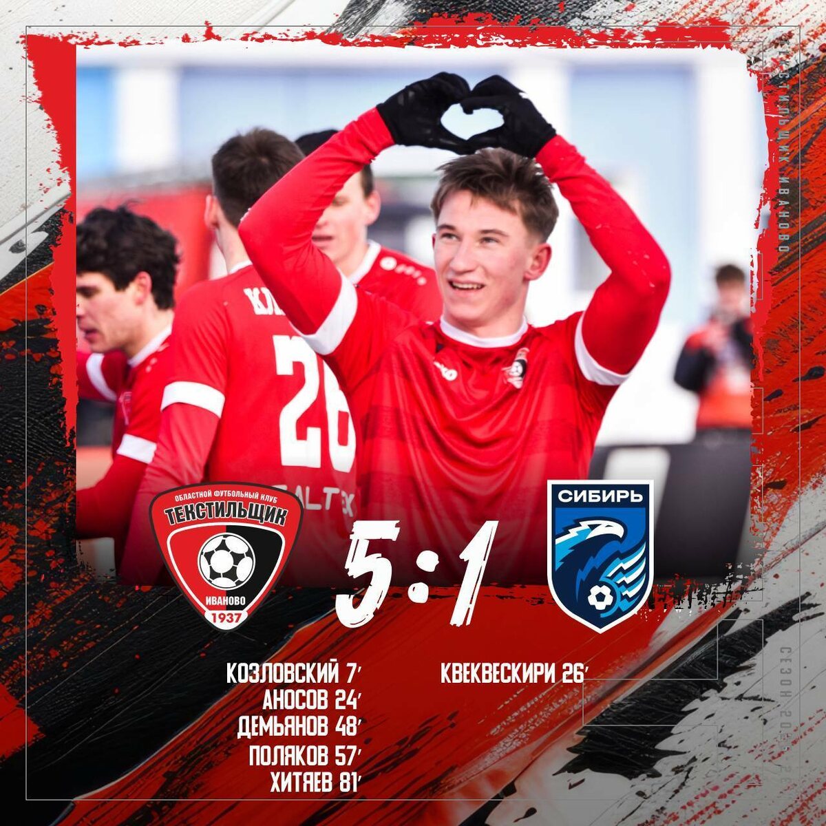 8 марта в Иванове состоялся первый в сезоне домашний матч футбольного клуба «Текстильщик». «Красно-черные» сразились с ФК «Сибирь» из Новосибирска. Первый мяч в ворота соперника ивановская команда отправила уже на 7-й минуте. На 18-й счет был уже 2:0. На 26-й соперник забил со штрафного. Вернувшись после перерыва, «Текстильщик» забил «Сибири» еще 3 мяча. В итоге 5:1 в пользу ивановской команды. Напомним, первый в весеннем сезоне матч «Текстильщика» прошел в Омске. Игра завершилась победой «красно-черных» над командой «Иртыш» со счетом 2:1. Видео, фото: ФК «Текстильщик»