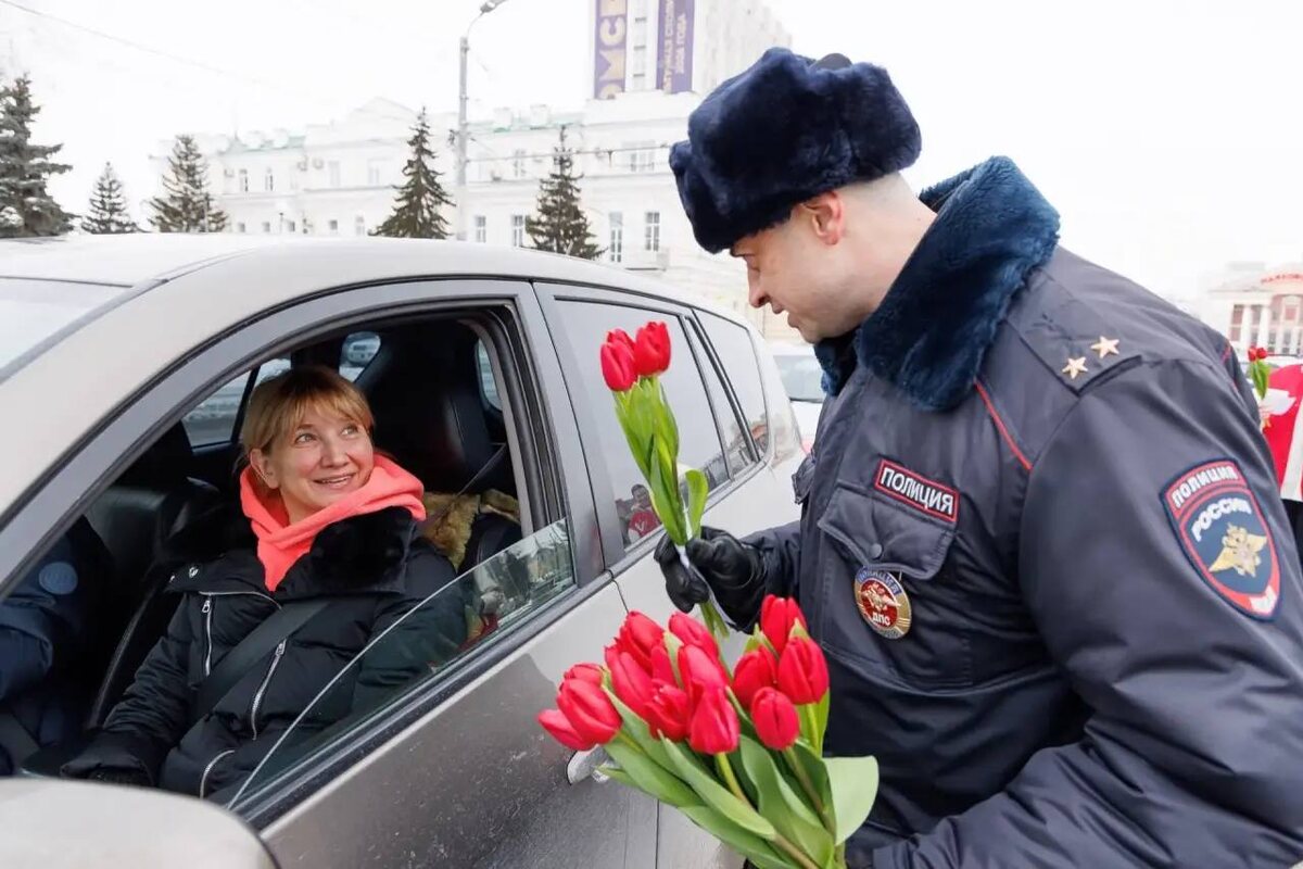 Сотрудники полиции вместе с членами общественных советов организовали в областном центре и районах — Исилькульском, Москаленском, Знаменском и Полтавском — акцию для женщин‑водителей. 🔻 На дороге вместо проверки документов им вручали весенние тюльпаны. Вместе с цветами женщины получали добрые пожелания семейного благополучия, тепла и аккуратного вождения. Фото: УМВД России по Омской области