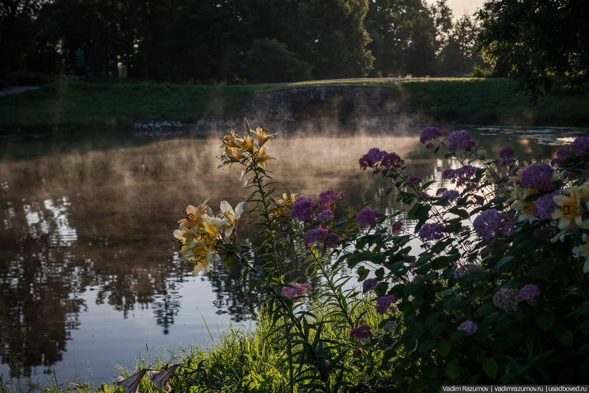 На фото - филиал рая на земле. Прекрасные сады в усадьбе Марьино. Розы, лилии, флоксы и гортензия в лучах рассвета и туманной дымке.