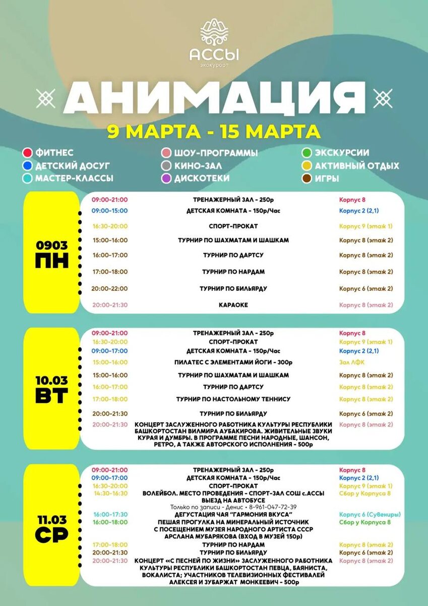 ! ✨ Дорогие друзья, ваша идеальная неделя начинается здесь! Мы составили программу так, чтобы каждый день был ярким событием. Хотите драйва или душевного отдыха? У нас есть всё! В программе этой недели: ⛰ Захватывающие экскурсии - открываем новые горизонты вместе; 💃 Зажигательные дискотеки - танцуем до упаду; 🎤 Вечера караоке - поём любимые хиты и раскрываем таланты. Листайте карусель ➡️, выбирайте самые интересные дни и приезжайте к нам за эмоциями! Помимо развлечений, вас ждут эффективные лечебные программы и приятные акции, чтобы отдых был не только веселым, но и полезным для здоровья. 🌱 Ждём всех! Проведите это время с пользой и удовольствием. Телефоны для бронирования: ☎ +7 (347) 201-08-85, ☎ +7 (906) 100-30-50