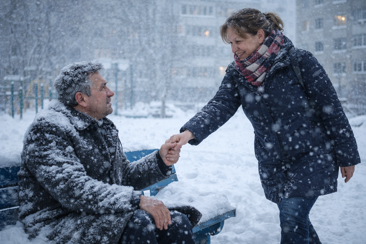 Мария Тимофеевна дошла до своего подъезда и тяжело вздохнула, предвкушая четыре этажа без лифта. Мельком глянула на занесённую снегом скамейку — и замерла. На скамейке, почти невидимой в снежной пелене, сидел человек. Мужчина в тёмном, явно не по сезону лёгком пальто, сидел неподвижно, позволяя снегу засыпать плечи и колени. Что-то в его позе — не просящей, не требующей внимания, а отрешённо-спокойной — заставило её подойти.