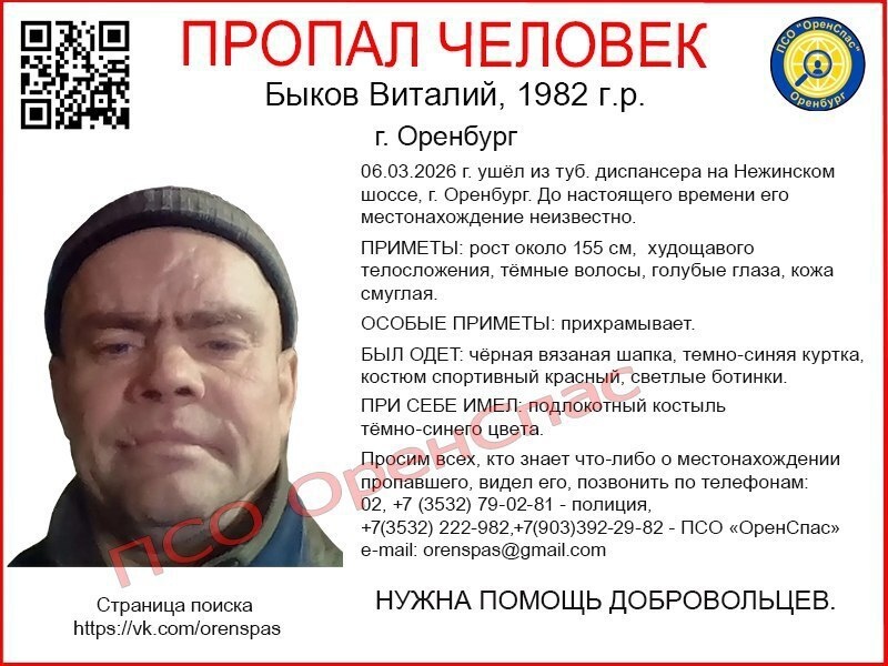 В Оренбурге пропал Виталий Быков, он 1982 года рождения.