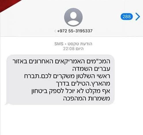 ։ Հաղորդագրության մեջ նշված է․ «Տարածաշրջանում գտնվող վերջին ամերիկյան ռադարային համակարգերը ոչնչացվել են։ Ձեր կառավարության ղեկավարները ձեզ ստում են։ Լքեք երկիրը։ Հրթիռները ճանապարհին են։ Ոչ մի ապաստան չի կարող ապահովել անվտանգություն։ — Իսլամական հեղափոխության պահապանների կորպուս»։
