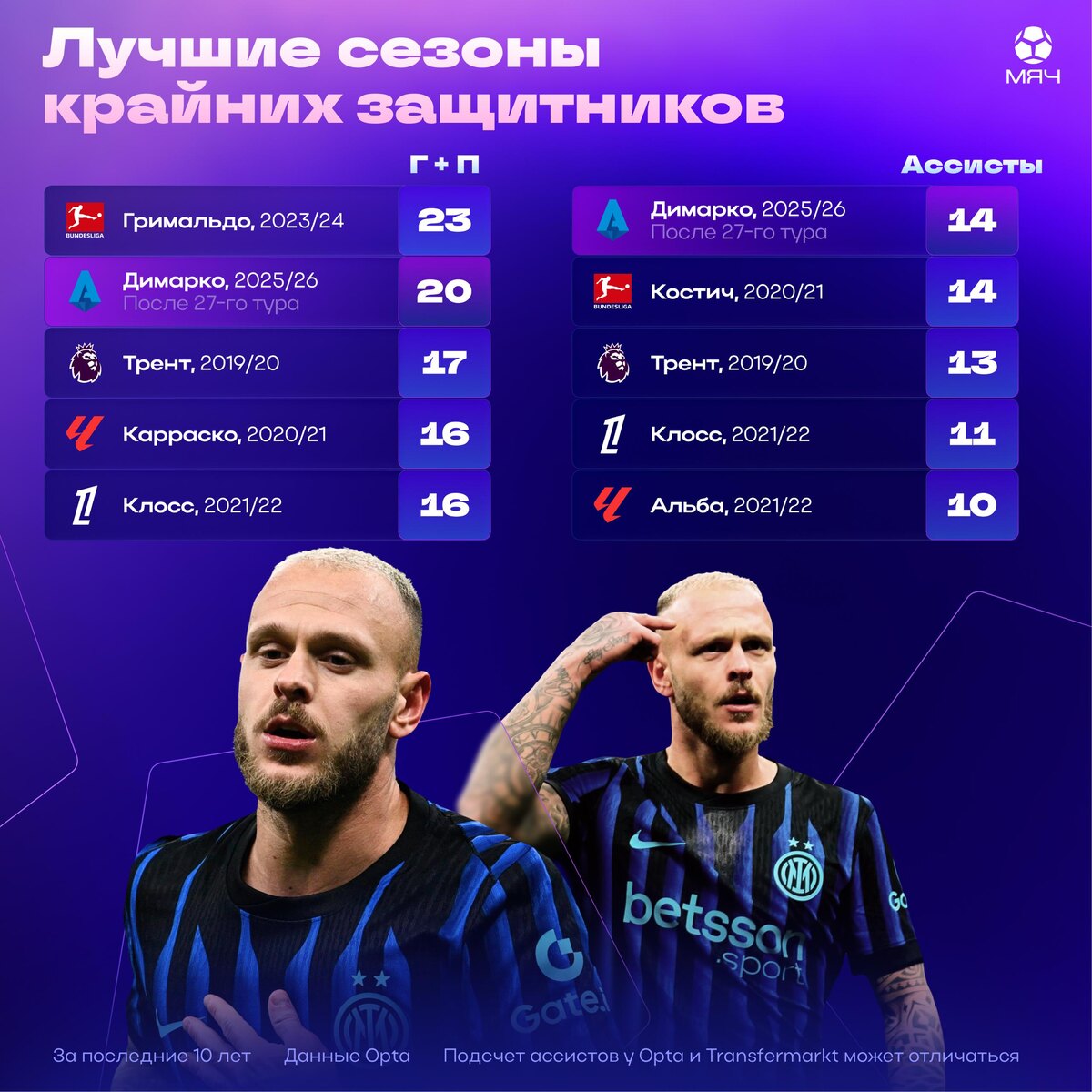 Вошел в прайм после провала в плей-офф ЛЧ Федерико Димарко в этом сезоне выдает исторические цифры – за последние 10 лет результативность выше среди латералей была только у Алекса Гримальдо. И то Федерико наверняка побьет и цифры испанца, и рекорд по ассистам в Серии А (по разным данным: 15 у Луиса Альберто или 16 у Папу Гомеса). Хотя сезон-2024/25 Димарко заканчивал в эмоциональной яме. Прошлый плей-офф ЛЧ оказался для Феде провальным – итальянца отвозили Ламин Ямаль и Дезире Дуэ, а в 3-х решающих матчах Симоне Индзаги снимал его до 60-й минуты. Поражение в финале воспитанник «нерадзурри» перенес крайне тяжело – закрылся в себе и отстранился от команды, которая стала токсичной из-за ухода тренера. Но Кристиан Киву вернул Димарко уверенность. Новый коуч стал больше доверять Федерико и дает играть – в прошлом сезоне латераль отбегал только 5 полных матчей и играл в среднем 72 минуты выходя в старте (меньше всех в команде), а сейчас получает в среднем 87 минут. Обновленная система ми