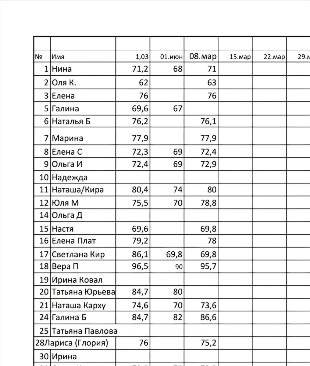 Здравствуйте, дорогие друзья и гости канала. Наконец-то я дождалась отчеты худеющих. Всему виной праздники, поэтому про отчеты некоторые забыли. Впереди праздников нет, поэтому отчитываться все будут вовремя. Колонка 1 июня - это цифры, которые мы бы хотели видеть к концу весеннего марафона. Кто еще не написал, пишите. Девочки, если увидите ошибки, напишите, я исправлю. В этом месяце почему-то опять не худеется. Но есть девочки, у которых отличный результат. Это Елена под номером 16 -минус 1,2.Это Вера П под номером 18 - минус 0,8. Это Наташа номер 21 - минус 1 кг. И Лариса под номером 28 - минус 0,8. Эти тюльпаны для вас. Я вас поздравляю с такими отличными результатами. Молодцы!!! А у меня продолжается ремонт.Вчера ездили к сестрам на поминки. Маме 9 дней. Электрика оставляла одного. Но мы были совсем немного по времени. И когда уже возвращались, он позвонил и сказал, что уже закончил всю работу. Предварительно сумму за работу мы не обговаривали. При общении с ним я поняла, что он