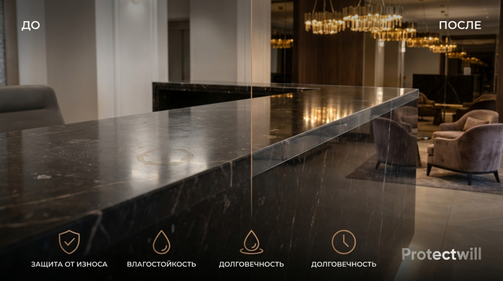 Технический факт: пористые материалы, будь то мрамор, оникс или дерево, работают как губка. Они впитывают органику, жиры и кислоты. Профессиональная переполировка мрамора снимает верхний слой камня, истончая его, и стоит в Москве от 5000 рублей за квадратный метр. При этом защита работает до первого пролитого бокала. В условиях высокого трафика ресторана или отеля это борьба с ветряными мельницами.