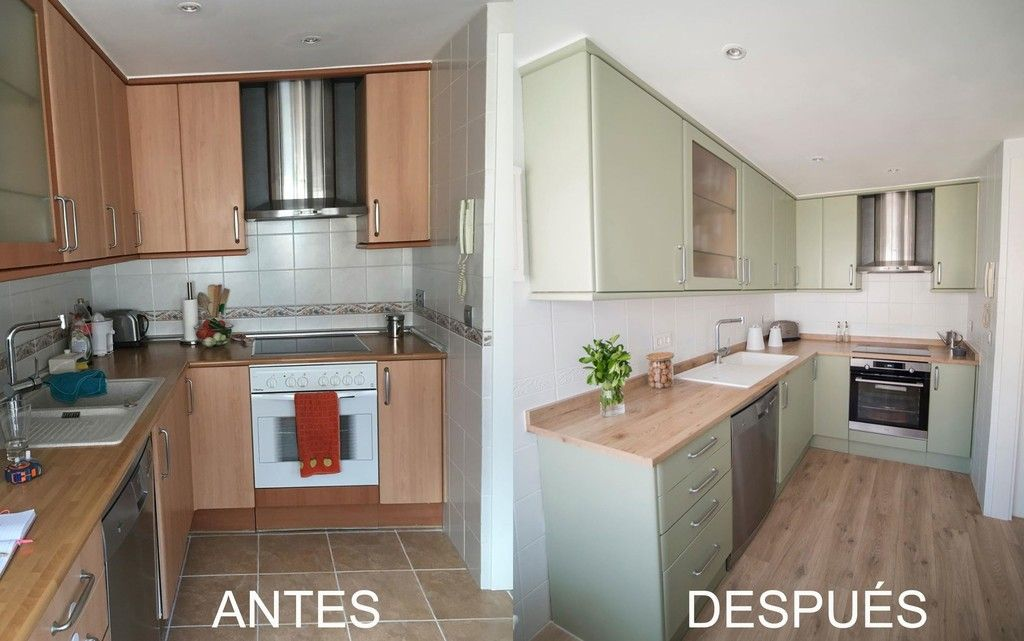 Перекраска кухонных фасадов — один из самых доступных способов обновить интерьер без полной замены гарнитура, но результат во многом зависит от материала фасадов. Давайте посмотрим примеры: В этой кухне основной эффект обновления достигнут именно за счёт перекраски фасадов. Тёплый древесный оттенок заменили на спокойный светло-оливковый цвет, благодаря чему пространство стало выглядеть более современно и визуально светлее. Вместе с перекраской обновили и некоторые детали: поменяли столешницу на более светлую под дерево, заменили плитку и напольное покрытие. Тёплый древесный цвет заменили на светлый оттенок латте (низ) и кремовый оттенок (вверх), благодаря чему кухня стала выглядеть гораздо легче и современнее. Рельефные фасады и стеклянные витрины сохранили, поэтому кухня не потеряла классический характер, но за счёт нового цвета пространство стало визуально светлее и аккуратнее. В этой кухне обновление сделали без замены гарнитура — фасады просто перекрасили. Тёмное лакированное дер