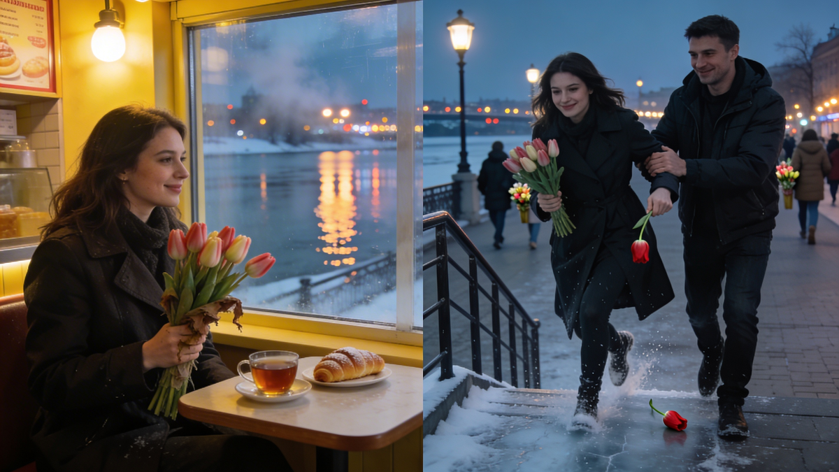 8 марта в Ростове-на-Дону у меня был не самый праздничный день. На работе мы, конечно, поздравляли девушек, дарили тюльпаны, шутили, но к вечеру я почувствовала только усталость и какое‑то пустое чувство: праздник есть, а настроения нет. Коллеги разошлись по своим делам, кто-то к мужьям и парням, кто-то к родителям, а я просто решила пройтись по набережной. Я зашла в небольшую кофейню рядом с Доном, заказала капучино и села у окна. Смотрела, как по набережной ходят люди с цветами, как отражаются фонари в воде. Мысль была одна: «Надо учиться радоваться хотя бы таким вечерам, а не только работе и дедлайнам». Допила кофе, взяла в руки свой маленький букет тюльпанов — подарок от коллег — и вышла на улицу. Когда я шла вдоль набережной, стало немного скользко: днём было тепло, всё подтаяло, а к вечеру подморозило. В одном месте у лестницы вниз к воде я неудачно наступила — и просто поехала. Тюльпаны вылетели из рук, я уже почти рухнула, но кто-то успел схватить меня за локоть и удержать. — О