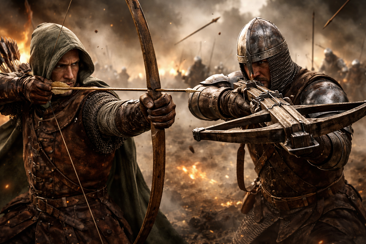 Если смотреть именно на поле боя, а не на отдельный выстрел, то у лука было почти страшное преимущество: он создавал плотность огня. Один арбалетчик стрелял сильнее, но медленнее. Один лучник — слабее по отдельному выстрелу, но гораздо быстрее.