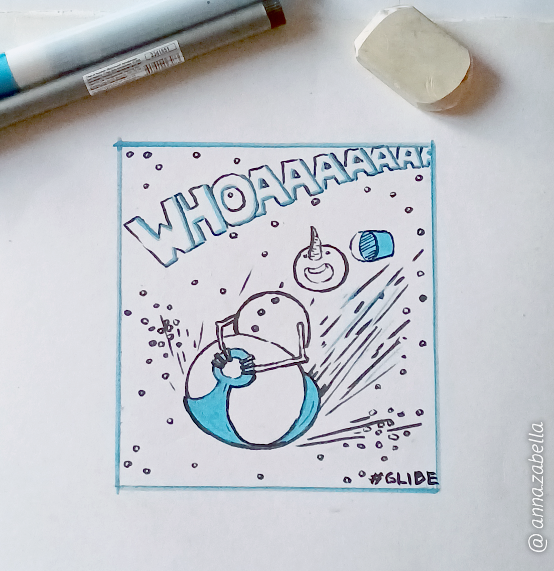 Нарисовала небольшую иллюстрацию для Inktober52, тема этой недели — GLIDE («скользить»). У меня получился снеговик, который разогнался так быстро, что буквально начинает разваливаться на части. ❄️ Кажется, у любого скольжения есть предел — особенно если вы сделаны из снега. Сначала сделала простой карандашный набросок, чтобы наметить движение и композицию. После этого обвела рисунок чёрными браш-линерами, чтобы добавить контраст и выразительность линий. Цвет добавляла акриловыми маркерами — хотела, чтобы иллюстрация получилась контрастной и немного графичной, с ощущением движения и разлетающегося снега. Мне нравится в таких небольших рисунках ловить момент движения — когда всё уже почти вышло из-под контроля. А как у вас прошла эта зима — спокойно или на полной скорости? ❄️💨 #annazabella_art
