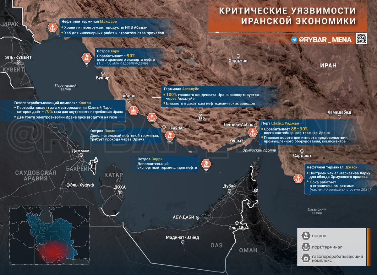 Израильская разведка через западные СМИ вбрасывает информацию о возможной подготовке операции американского спецназа против острова Харк — главного нефтяного терминала Ирана. В целом статья Axios — из того же разряда, что и фейк про удар ОАЭ по опреснительной установке в Иране, и преследует цель еще сильнее втянуть США и страны региона в лобовое противостояние с гуманитарными последствиями. Но все-таки, если отбросить информационный шум и посмотреть на карту критической инфраструктуры Ирана — Харк далеко не единственная болевая точка. И, возможно, даже не самая уязвимая. 🔻Болевые точки иранской экономики 🔸Порт Шахид Раджаи (Бандар-Аббас) — обрабатывает 55% всей торговли страны, включая продовольствие, медикаменты, промышленное оборудование. Удар здесь бьёт не только по доходам, но и по импорту критических товаров, рискуя спровоцировать дефицит продовольствия. 🔸Канган — газоперерабатывающий комплекс Южного Парса перерабатывает газ с месторождения, которое даёт ~70% газа для Ирана. Дв