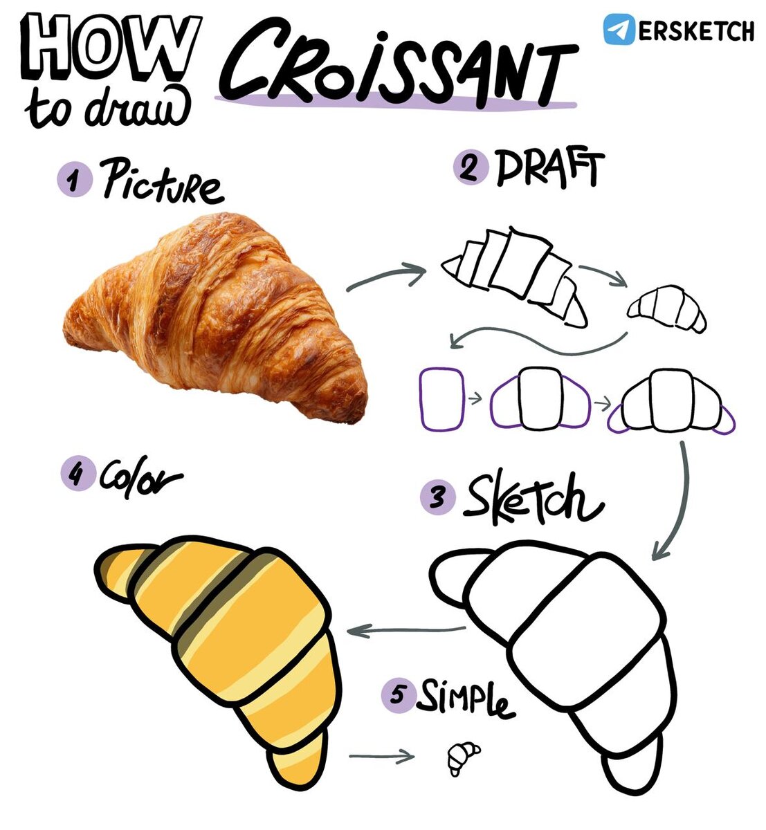 Начнём рисовать круассан с центральной части. Это симметричная трапеция с округлыми краями. От центра в разные стороны отходят загнутые ушки, а от них — ушки поменьше. Настоящий круассан не бывает идеально симметричным, так что если ушки будут немного разной формы — это даже хорошо.