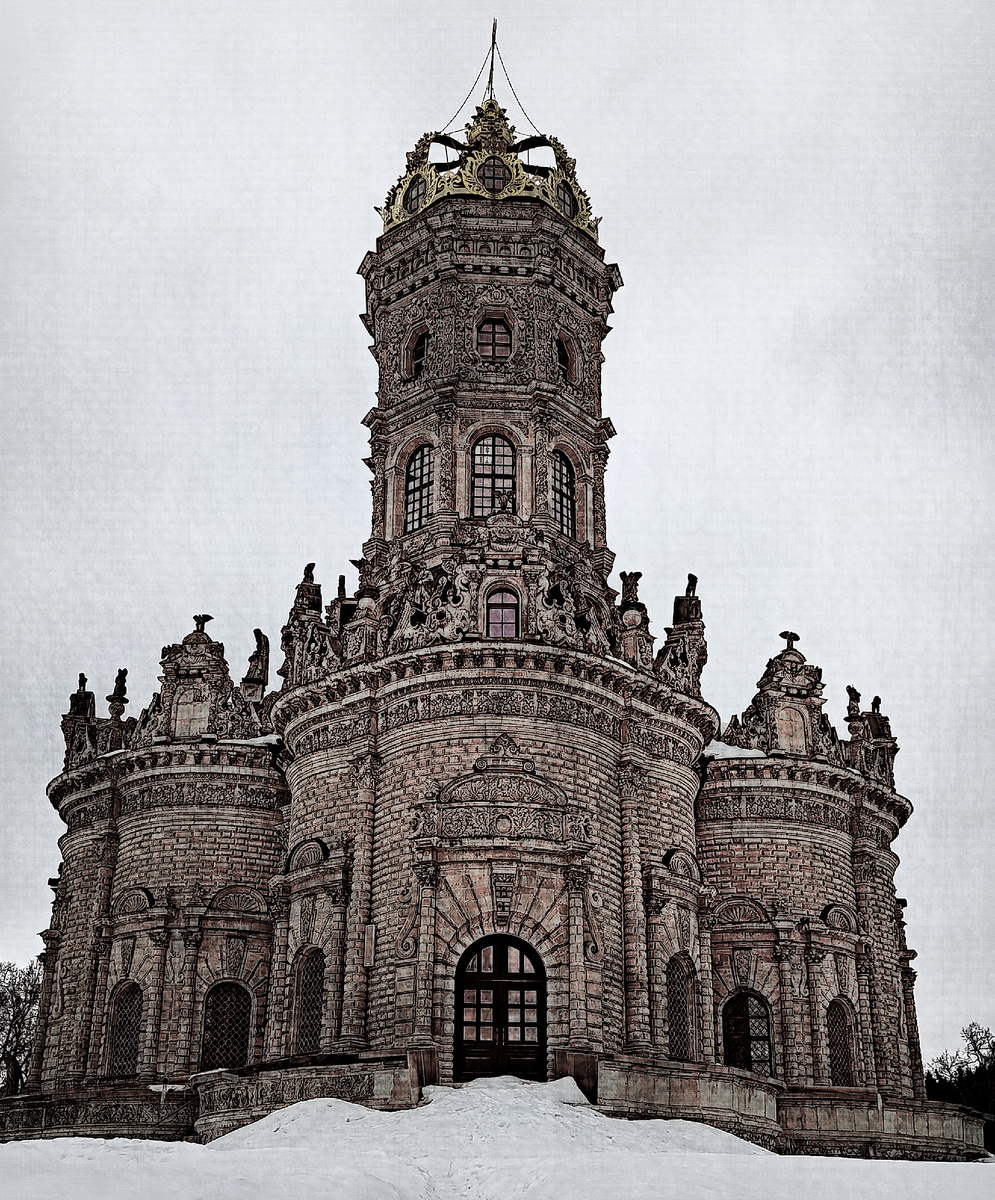 Это церковь Знамения Пресвятой Богородицы в Дубровицах. Правда, она удивительная? Когда я послала фотографию своей сестре, она спросила - Вы за границей? Вопрос логичный, потому что церковь эта не похожа ни на один другой русский храм – она словно перенесена к нам из Западной Европы. Один из самых необычных храмов Подмосковья строился с 1690 года при князе Борисе Голицыне. Воспитатель Петра I в ту пору из-за клеветы впал в немилость царя и был сослан в подмосковное имение. Опала закончилась. Голицын получил чин боярина и, видимо, в знак благодарности, стал возводить дубровицкий храм. Говорят, что князь симпатизировал католицизму, видимо поэтому Знаменский храм получился очень красивым, но больше похожим на католический костел. Здание выстроено в стиле барокко, покрыто лепниной, а венчает его ажурная золотая корона, что тоже уникально для православной архитектуры. Храм построили из белого камня, который добывали в Сьянских каменоломнях (есть такое место в Подмосковье, в районе Домодед