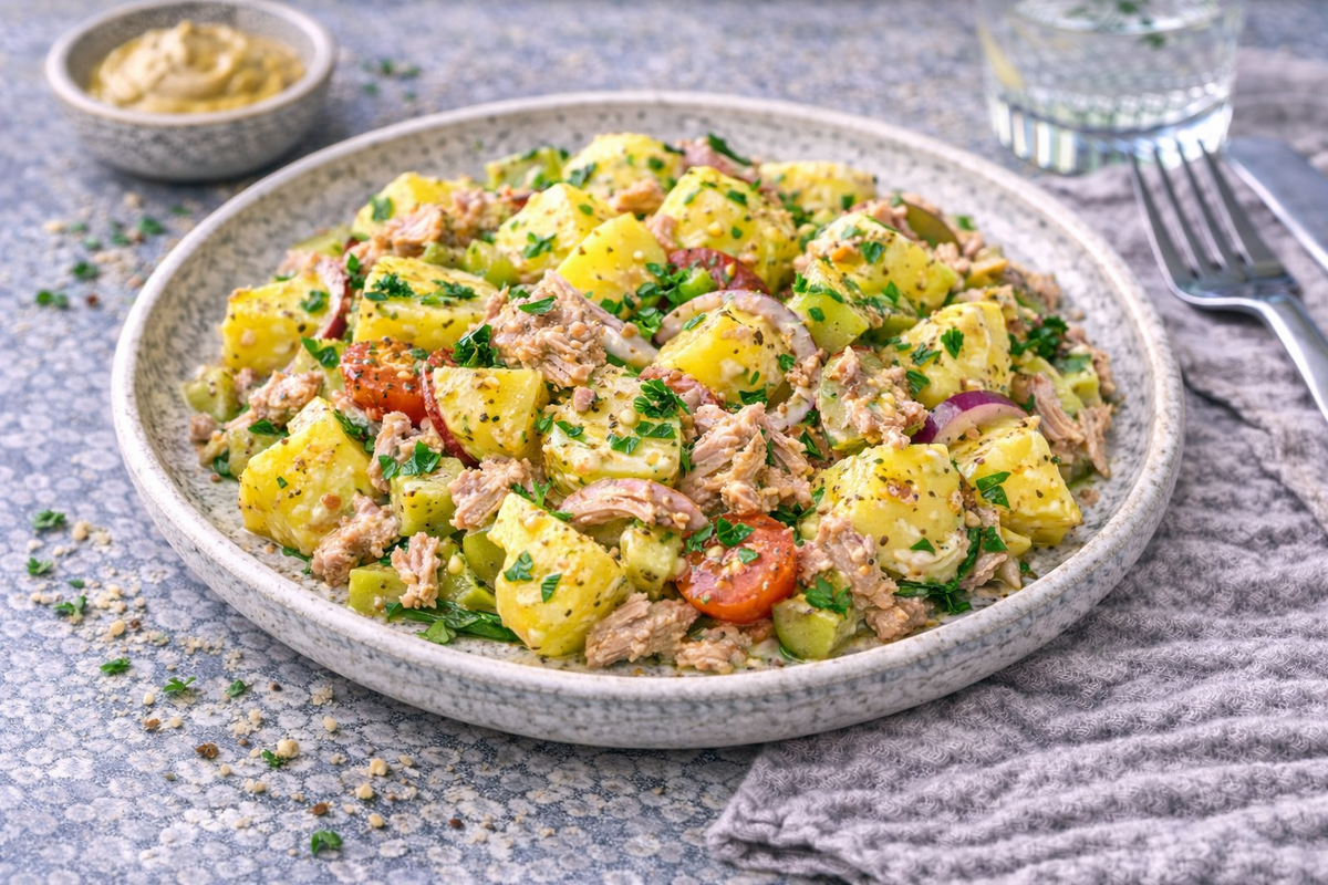 Нежный тёплый картофель, сочный тунец, пикантная горчичная заправка на йогурте и свежая зелень. Всё смешивается за минуты - белок, клетчатка и комфортный вкус без лишних калорий ✨ - Картофель - 250 г 🥔 - Тунец в собственном соку - 120 г 🐟 - Огурец солёный/маринованный - 60 г - Лук красный - 30 г 🧅 - Греческий йогурт 2% - 70 г 🥛 - Горчица (дижонская или зернистая) - 10 г - Лимонный сок - 10 мл 🍋 - Свежая зелень (укроп, петрушка или зелёный лук) - 10 г 🌿 - Соль, свежемолотый чёрный перец - по вкусу - Хочешь ещё белковее - добавь 100 г яичных белков или 1 отварное яйцо. - Для остроты - добавь в заправку ½ ч. л. дижонской горчицы с зёрнами или щепотку чили. - Если хочешь холодный вариант - остуди картофель и подавай как классический салат. ~25 минут (из них активных - около 10 минут) ≈ 550 ккал Белки - 36 г Жиры - 15 г Углеводы - 70 г - Высокий белок от тунца + клетчатка от картофеля и овощей = сытость на 4-5 часов без тяжести - Нежный тёплый картофель + пикантная горчичная заправка