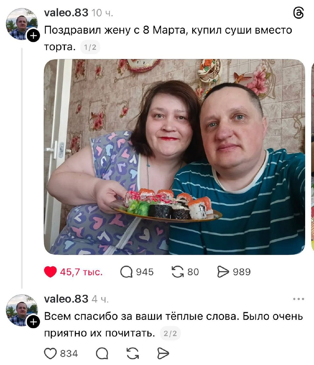 подобные посты, и я рада что такой контент появляется все чаще и чаще. огорчает как много людей, у которых голова засрана картинками с пинтерест и представлениями как кому-то надо жить бегут в комменты писать гадости. а я прикладываю наше неинстаграмное фото со вчерашнего празднования у родителей. у нас вообще глобальное событие: мы впервые парились в бане, которую родители строили пять лет. даже Мира посидела в парилке 10 минут. это для которой я шила занавески и скатерть. а тюльпанов у меня вообще нет, считаю преступным отдавать за них такие деньги, вместо этого попросила у мужа банку красной икры. хотя от роллов я бы тоже не отказалась.