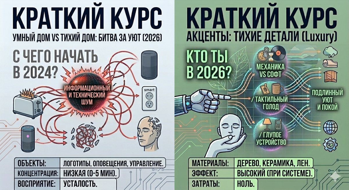 В 2026 году дом перестал быть нашей крепостью и стал сложным IT-проектом. Мы застряли в «интернете вещей» (IoT), где каждое устройство требует обновления, подписки и внимания. Вместо того чтобы облегчать жизнь, технологии начали диктовать свои условия. Разбираемся за 2 минуты: как в мире тотальной автоматизации вернуть себе право просто нажать на выключатель. Проблема 2026 года — избыточная функциональность. В 2026-м вы больше не владеете своими вещами. Вы их арендуете. Ваш дом знает о вас больше, чем психолог. Уровень 1: «Аналоговые острова»
