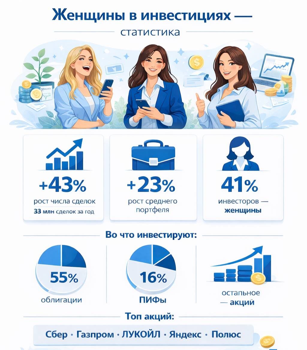 😊 Сегодня хочется не просто поздравить, но и показать, какие вы молодцы. «СберИнвестиции» выпустили исследование, которое приурочили к празднику. Посмотрите, как выросла ваша инвестиционная активность: ✅ За год число сделок у женщин‑инвесторов выросло на 43% - до 33 млн ✅ Средний портфель подрос на 23% ✅ Сейчас 41% клиентов «СберИнвестиций» - женщины Что особенно радует - вы выбираете в основном долгосрочные стратегии. Не гонитесь за быстрой прибылью, а строите капитал на годы вперёд🔥 👉 55% ваших вложений - в облигации. Это консервативно и надежно. 👉 16% - в ПИФы. Грамотная диверсификация. 👉 И даже в акциях вы держитесь стабильных и надежных эмитентов: Сбер, Газпром, ЛУКОЙЛ - лидеры второй год подряд. А ещё в топ‑5 вошли Яндекс и Полюс. Немного инвестиционной географии: Больше всего женщин‑инвесторов в Москве, области и Петербурге. А среди регионов лидируют Краснодарский край, Свердловская область и Башкортостан. И да, Краснодарский край занял второе место по числу новых инве