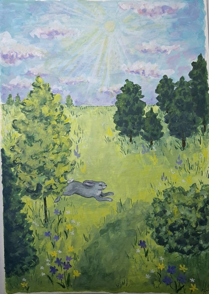 Поэтому, пейзаж наш будет светлым, летним. В рисунке показываем локации двух миров «луг» и «сосновый лесок» (спасение зайца).