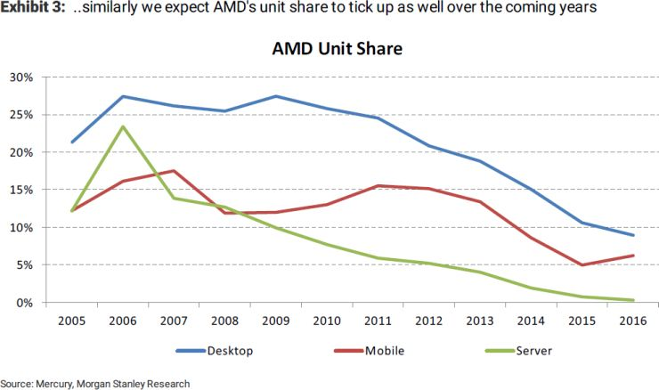 К началу 10-х годов, доля AMD на рынке центральных процессоров неуклонно снижалась:
