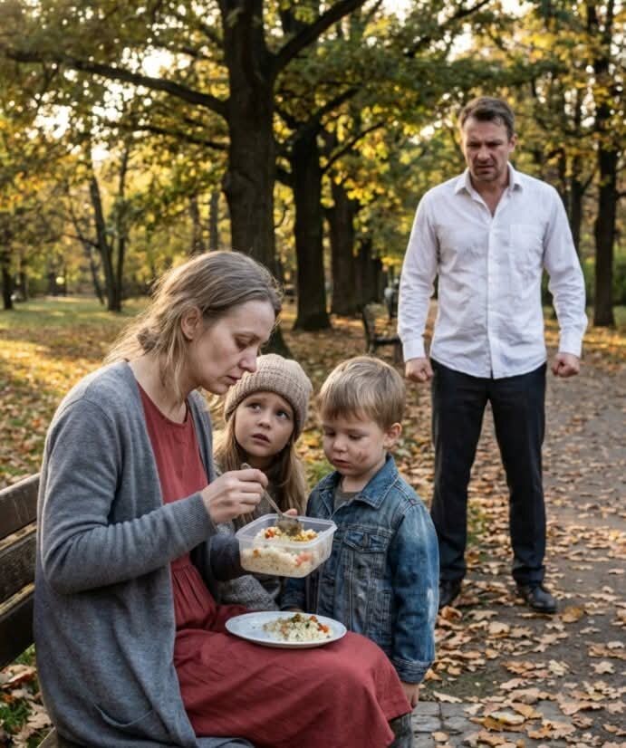 На скамье сидела хрупкая женщина. На коленях у неё стоял белый горшок. Рядом двое детей: мальчик лет восьми с неровно подстриженными волосами и младшая девочка с глазами, слишком большими для тонкого лица. Одежда чистая, но изношенная — скорее бережно сохранённая, чем обновлённая.