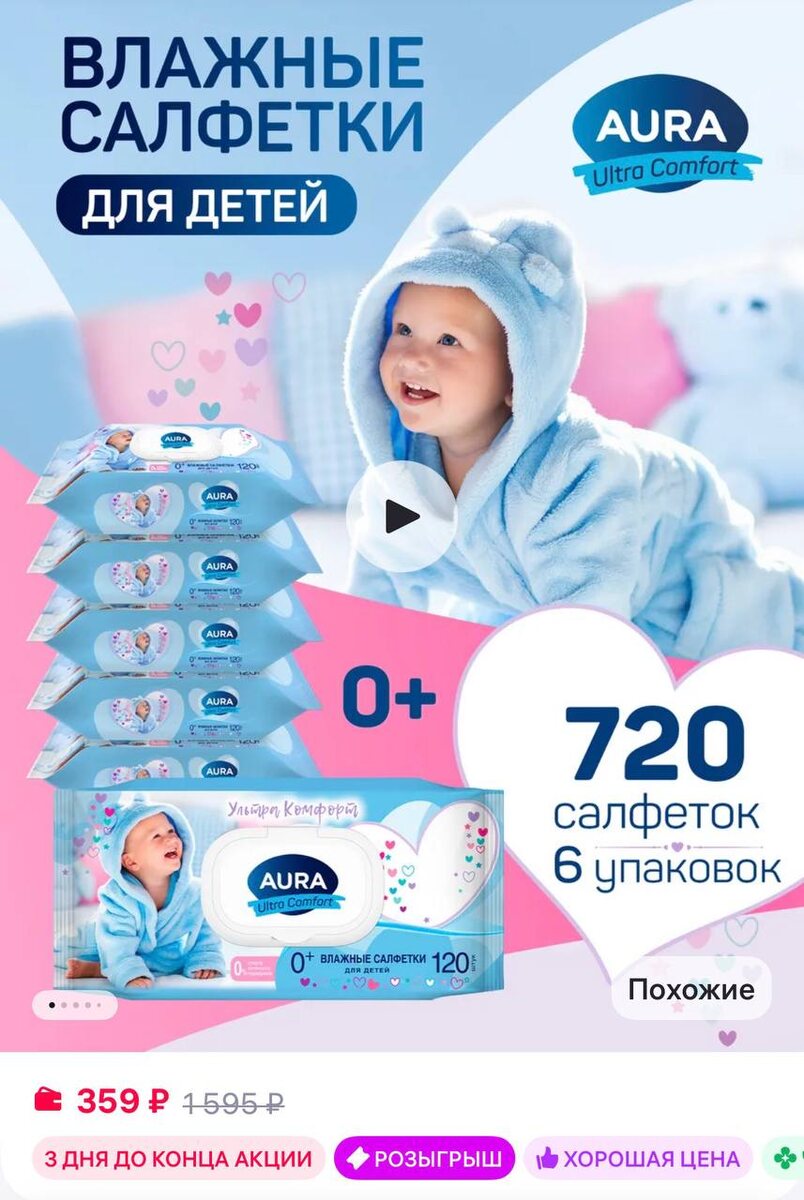720 шт Aura Влажные детские салфетки с клапаном для новорожденных 6уп х…