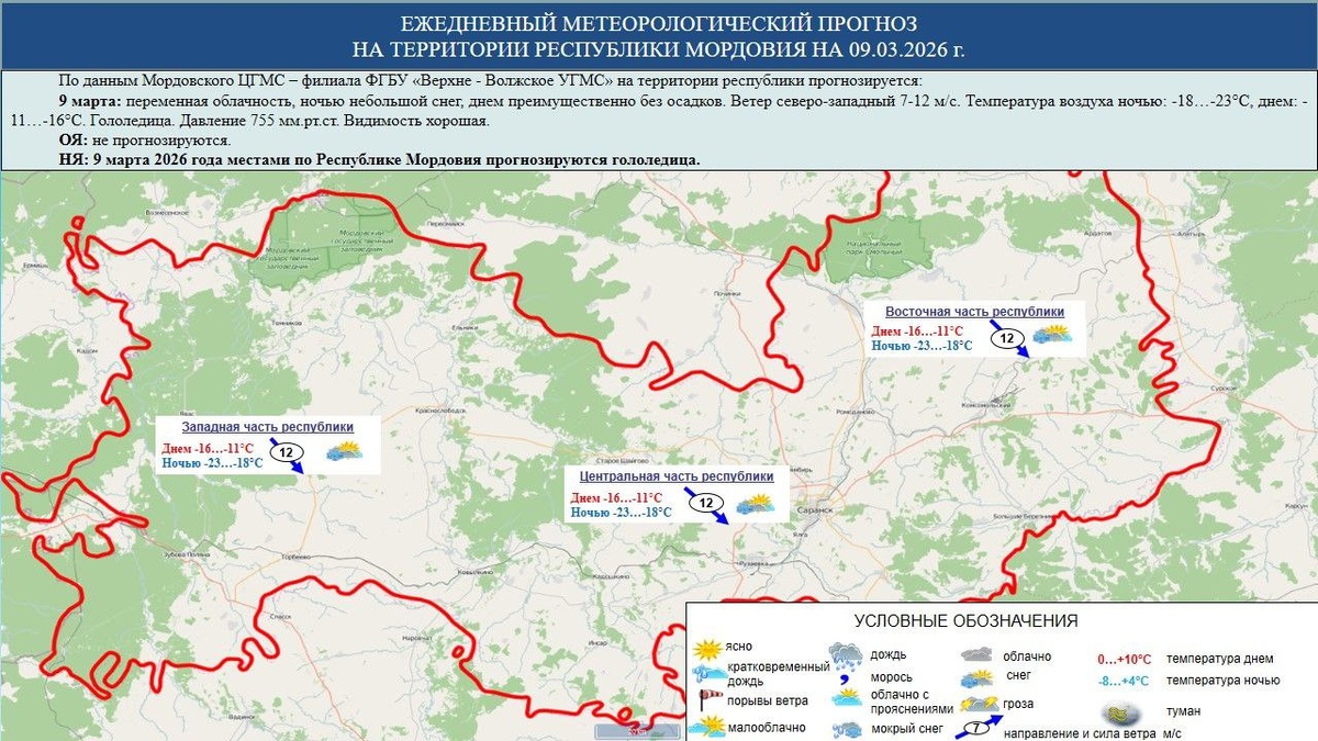 🌨 9 марта в Мордовии переменная облачность, ночью небольшой снег, днем преимущественно без осадков, гололедица