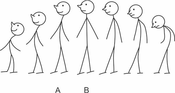 На рисунке он изобразил человека, пришедшего в наш мир и соответственно на выходе из него. Получилась большая разница. Приходя в этот мир, мы ощущаем себя хозяевами жизни, полны энтузиазма и веры в себя, фантазируем, мечтаем и ощущаем себя самыми важными. У людей, поживших на Земле нечасто можно встретить такой прилив энтузиазма и веры в собственные силы. И по факту получается так, что самооценка выше на входе, чем на выходе. Не буду говорить, что у всех. Думаю, именно так у многих людей.