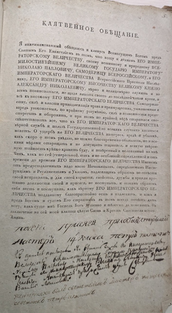 ) гос. служащих Российской Империи Делюсь находками из ЦГИА СПб, открывшегося 12 января после переезда В деле Фонд 1244. Опись 1. Дело 58 О приеме П.Потапова старшим мастером оказалось 🔥собственноручно подписанное "Клятвенное обещание" старшего мастера 14 класса Петра Патапова, пра4дедушки 📌Историческая справка С древнейших времен при поступлении на службу существовал обычай давать клятву верности (приносить присягу). В Российской Империи присягали на верность ⏳офицеры и солдаты (воинская присяга) ⏳статские (гражданские) чиновники ⏳иностранцы при получении рос. подданства etc 📕Присяга имевших чин статских чиновников установлена в июне 1719 г. указом Петра I «О присяге на верность службы» для Сената и коллегий, губернаторов, воевод и других управителей и служителей. Впоследствии к присяге стали приводиться при вступлении в должность все чиновники высших, центральных и местных органов гос. управления 📕Военная присяга введена еще в 1647-м при Алексее Михайловиче Ритуал приведени