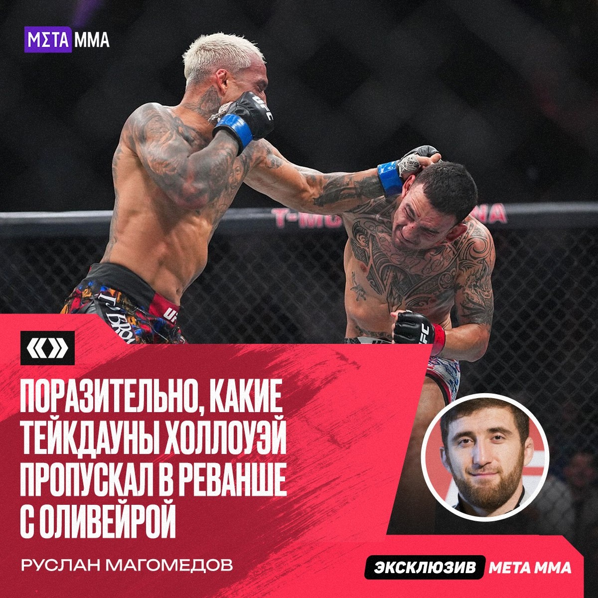 ΠΡΠ²ΡΠΈΠΉ Π±ΠΎΠ΅Ρ UFC Π ΡΡΠ»Π°Π½ ΠΠ°Π³ΠΎΠΌΠ΅Π΄ΠΎΠ² ΠΏΡΠΎΠΊΠΎΠΌΠΌΠ΅Π½ΡΠΈΡΠΎΠ²Π°Π» ΠΏΠΎΠ΅Π΄ΠΈΠ½ΠΎΠΊ ΠΌΠ΅ΠΆΠ΄Ρ ΠΠ°ΠΊΡΠΎΠΌ Π₯ΠΎΠ»Π»ΠΎΡΡΠ΅ΠΌ ΠΈ Π§Π°ΡΠ»ΡΠ·ΠΎΠΌ ΠΠ»ΠΈΠ²Π΅ΠΉΡΠΎΠΉ, Π² ΠΊΠΎΡΠΎΡΠΎΠΌ Π±ΡΠ°Π·ΠΈΠ»Π΅Ρ Π·Π°Π²ΠΎΠ΅Π²Π°Π» ΠΏΠΎΡΡ BMF. Β«ΠΡΠ΅Π΄ΠΏΠΎΠ»Π°Π³Π°Π», ΡΡΠΎ ΠΠ°ΠΊΡ Π±ΡΠ΄Π΅Ρ Π»ΡΡΡΠ΅ Π΄Π²ΠΈΠ³Π°ΡΡΡΡ ΠΈ Π·Π°ΡΠΈΡΠ°ΡΡΡΡ. ΠΠΎΡΠ°Π·ΠΈΡΠ΅Π»ΡΠ½ΠΎ, ΠΊΠ°ΠΊΠΈΠ΅ ΠΎΠ½ ΠΏΡΠΎΠΏΡΡΠΊΠ°Π» ΡΠ΅ΠΉΠΊΠ΄Π°ΡΠ½Ρ. ΠΠ°ΠΊ Π½Π° ΡΠ°ΠΊΠΎΠΌ ΡΡΠΎΠ²Π½Π΅ ΠΌΠΎΠΆΠ½ΠΎ ΡΠ°ΠΊ Π»Π΅Π³ΠΊΠΎ ΠΎΡΠ΄Π°Π²Π°ΡΡ ΡΠΏΠΈΠ½Ρ? ΠΠΎΠ½ΡΡΠ½ΠΎ, Π΅ΡΠ»ΠΈ ΡΡΠΏΠ΅ΡΠ±ΡΠΎΡΠΊΠΈ, Π½ΠΎ ΡΡΡ ΠΏΡΠΎΡΡΡΠ΅ Π·Π°ΡΠ΅ΠΏΡ, ΠΈ Π₯ΠΎΠ»Π»ΠΎΡΡΠΉ Π»Π΅ΠΆΠΈΡ, Π½Π΅ ΠΏΠΎΠ΄Π½ΠΈΠΌΠ°ΡΡΡ. ΠΡ Π²ΡΠ΅ Π·Π½Π°Π»ΠΈ, ΡΡΠΎ ΠΠ»ΠΈΠ²Π΅ΠΉΡΠ° Π±ΡΠ΄Π΅Ρ Π±ΠΎΡΠΎΡΡΡΡ. ΠΡΠΎ Π±ΡΠ΄Π΅Ρ Π±ΠΎΠΊΡΠΈΡΠΎΠ²Π°ΡΡ Ρ ΠΠ°ΠΊΡΠΎΠΌ? ΠΡΠ΅ Π·Π½Π°Π»ΠΈ ΠΏΠ»Π°Π½ Π½Π° Π±ΠΎΠΉ, ΠΈ Π₯ΠΎΠ»Π»ΠΎΡΡΠΉ Π² ΠΊΠ°ΠΆΠ΄ΠΎΠΌ ΡΠ°ΡΠ½Π΄Π΅ ΠΎΡΠ΄Π°Π²Π°Π» ΡΠΏΠΈΠ½Ρ. Π― Π±ΡΠ» ΠΏΠΎΡΠ°ΠΆΠ΅Π½. Π§Π°ΡΠ»ΡΠ· Π½ΠΈΡΠ΅Π³ΠΎ ΠΎΡΠΎΠ±Π΅Π½Π½ΠΎΠ³ΠΎ Π½Π΅ Π΄Π΅Π»Π°Π». ΠΡΠΎ ΠΡΠ»Π°ΠΌ ΠΠ°Ρ